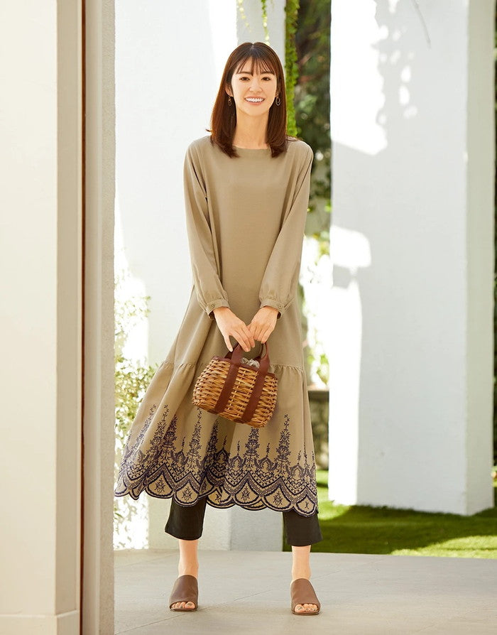 ・繊細な裾のスカラップ刺しゅうとティアードデザインが大人可愛いワンピース