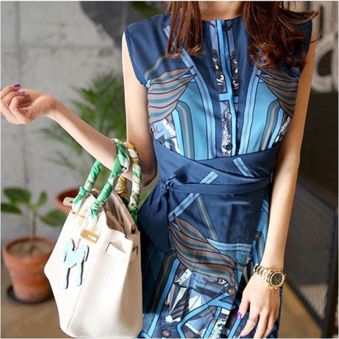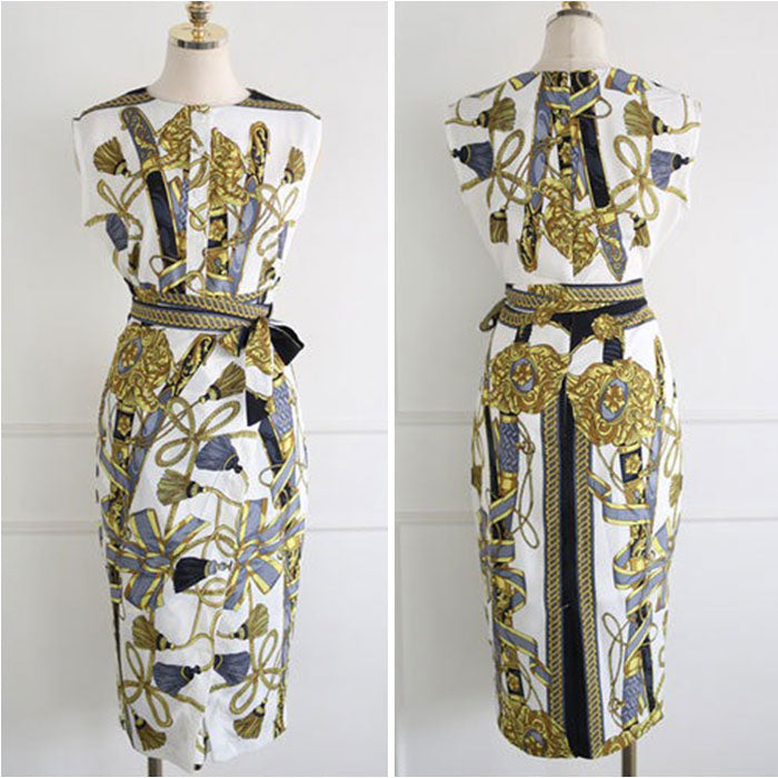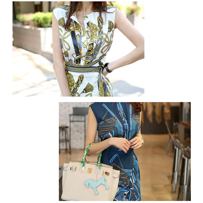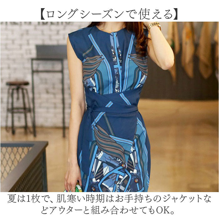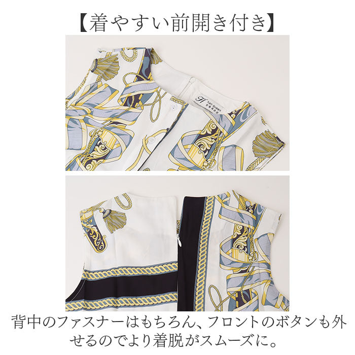 ・ストール風のデザインを大胆にプリントされた見た目で華やかに決まる。