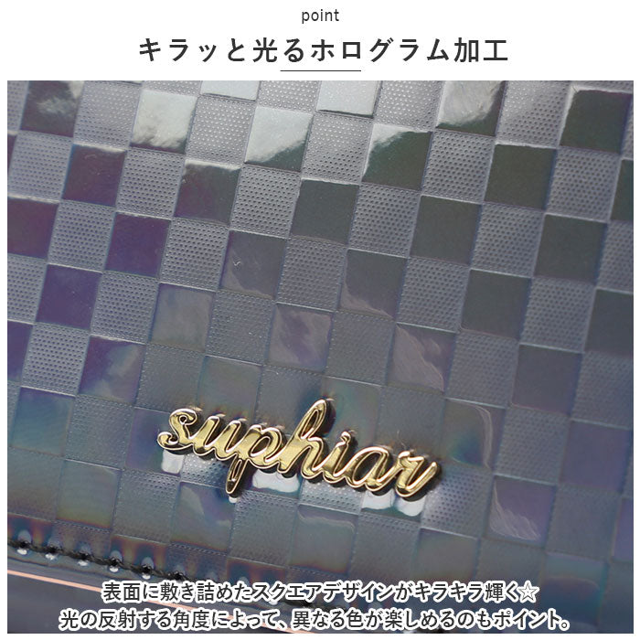 ・表面に敷き詰めたスクエアデザインがキラキラ輝く☆光の反射する角度によって、異なる色が楽しめるのもポイント。