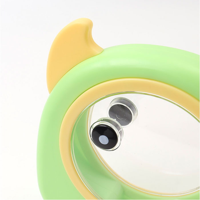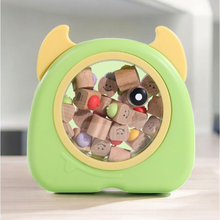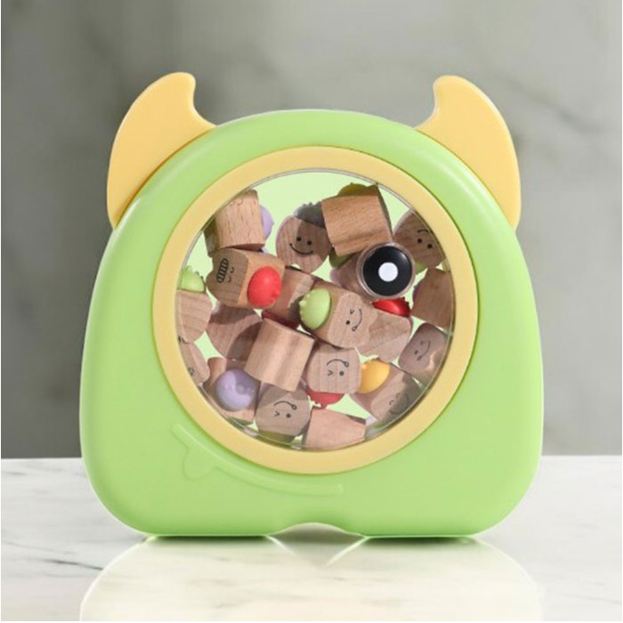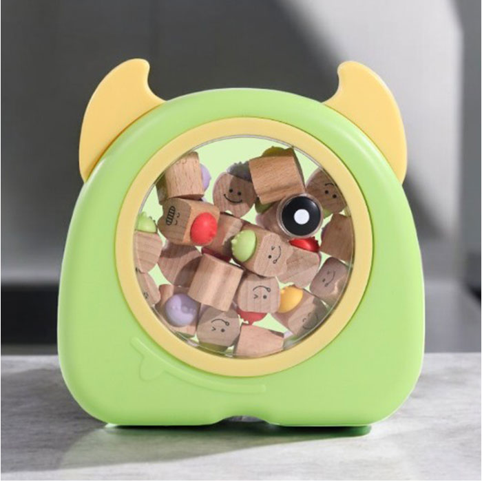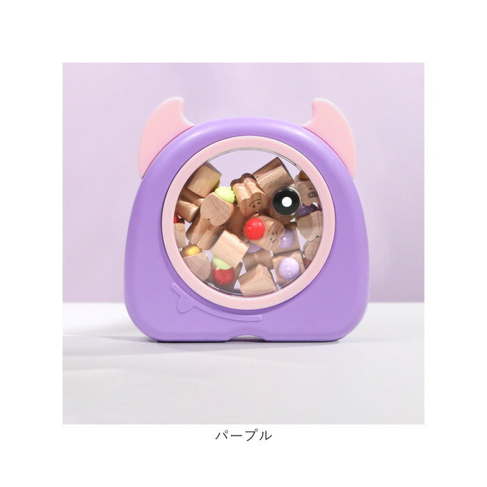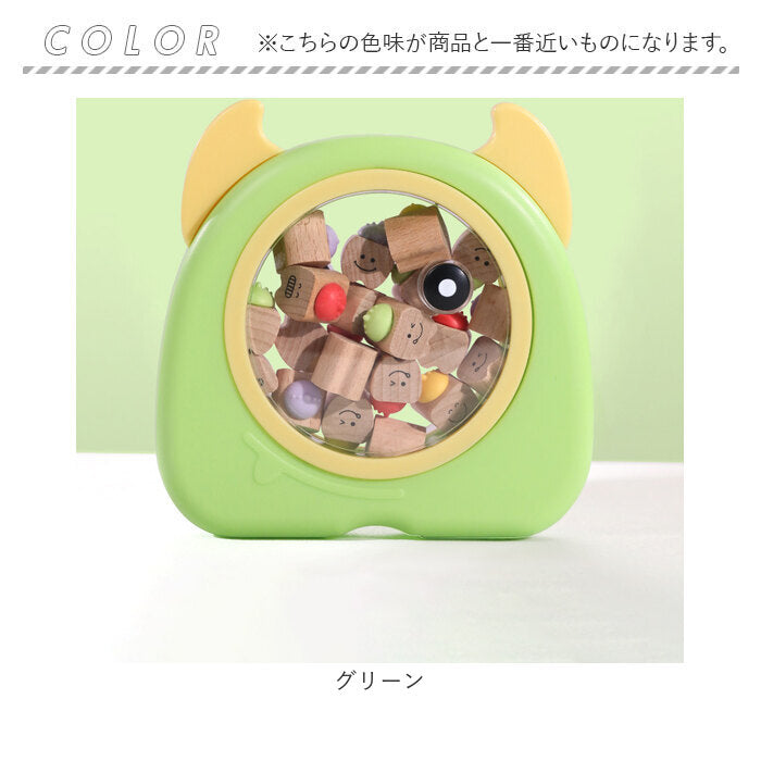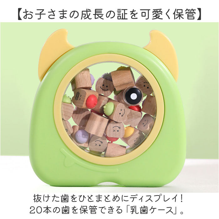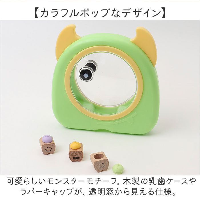 ・可愛らしいモンスターモチーフ。木製の乳歯ケースやラバーキャップが、透明窓から見える仕様。