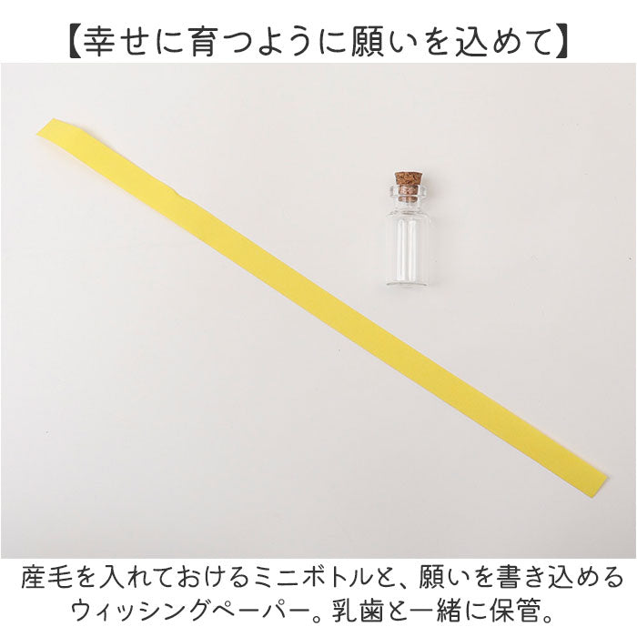 ・産毛を入れておけるミニボトルと、願いを書き込めるウィッシングペーパー。乳歯と一緒に保管。