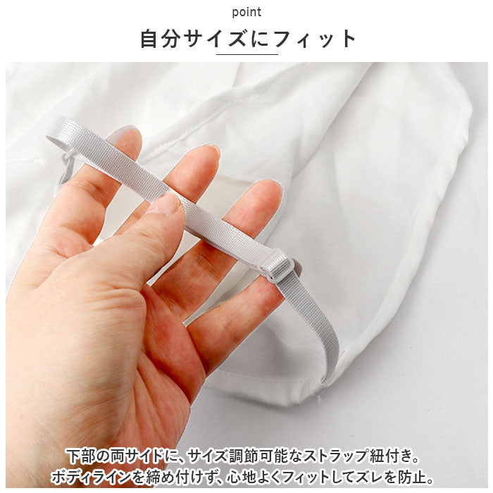 ・下部の両サイドに、サイズ調節可能なストラップ紐付き。ボディラインを締め付けず、心地よくフィットしてズレを防止。