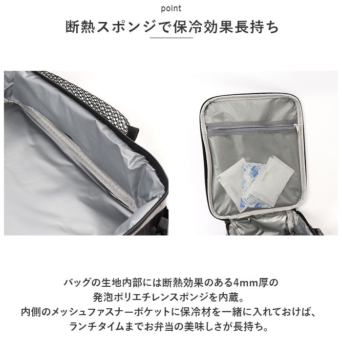 ・バッグの生地内部には断熱効果のある4mm厚の発泡ポリエチレンスポンジを内蔵。内側のメッシュファスナーポケットに保冷材を一緒に入れておけば、ランチタイムまでお弁当の美味しさが長持ち。