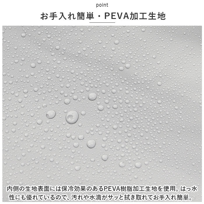 ・内側の生地表面には保冷効果のあるPEVA樹脂加工生地を使用。はっ水性にも優れているので、汚れや水滴がサッと拭き取れてお手入れ簡単。