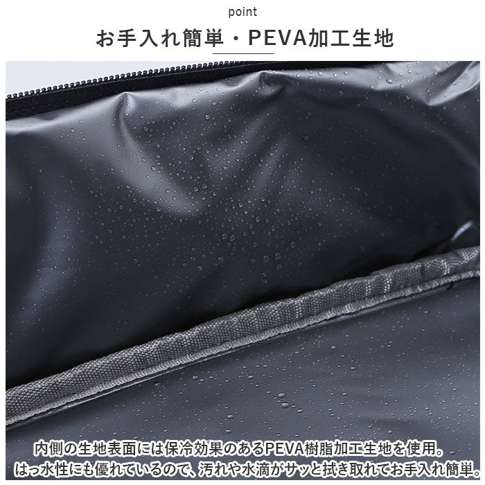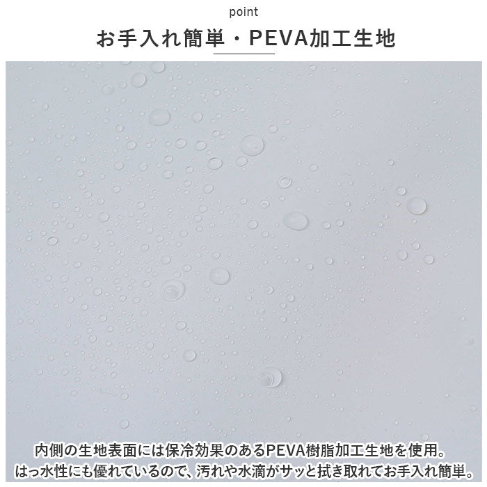 ・内側の生地表面には保冷効果のあるPEVA樹脂加工生地を使用。はっ水性にも優れているので、汚れや水滴がサッと拭き取れてお手入れ簡単。
