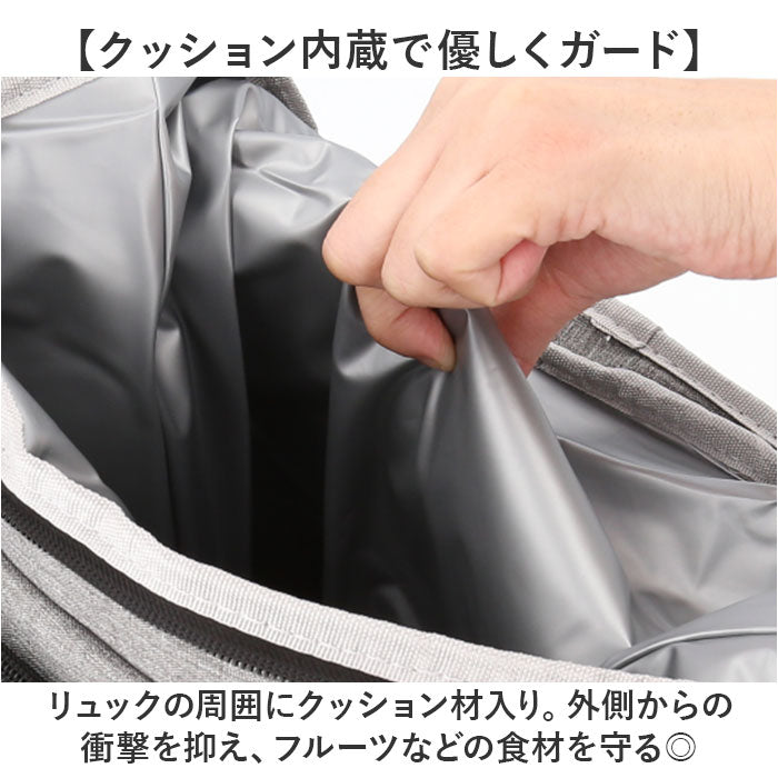 ・リュックの周囲にクッション材入り。外側からの衝撃を抑え、フルーツなどの食材を守る◎