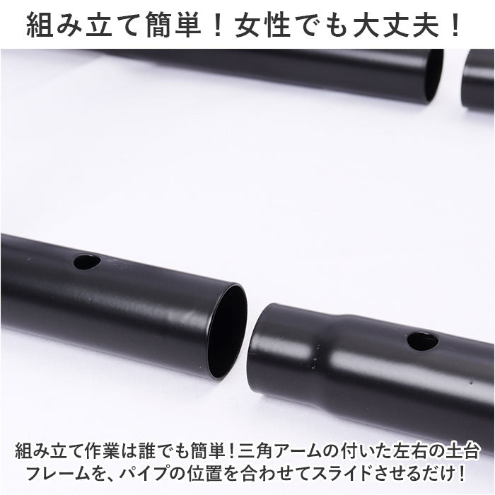・組み立て作業は誰でも簡単!三角アームの付いた左右の土台フレームを、パイプの位置を合わせてスライドさせるだけ!