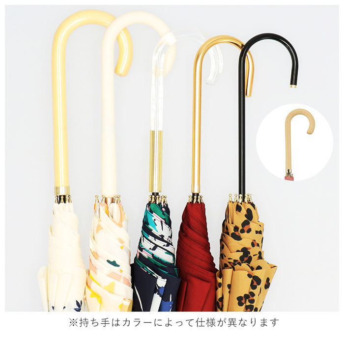 ・手元ハンドルのマテリアルには、ナチュラルで素材感のあるウッド調のものや、マットな肌触りで握りやすい樹脂製、細みで華奢なフォルムのアルミゴールド色まで、バリエーション豊富。傘生地のデザインだけでなく好みのハンドルがチョイスできる。