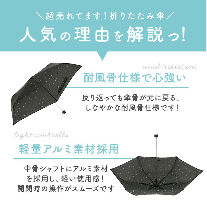 ・中骨シャフトに軽量なアルミ素材を採用し、開閉時の操作がスムーズ!傘生地を広げれば、親骨約55cmと大きめで長傘と比べても遜色のないサイズ♪