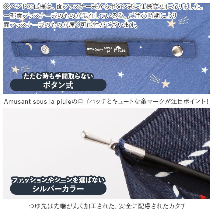 ・傘生地はマジックテープ式のバンドでサッと広げられて、たたむ時も手間取らない♪Amusant sous la pluieのロゴパッチとキュートな傘マークが注目ポイント!
