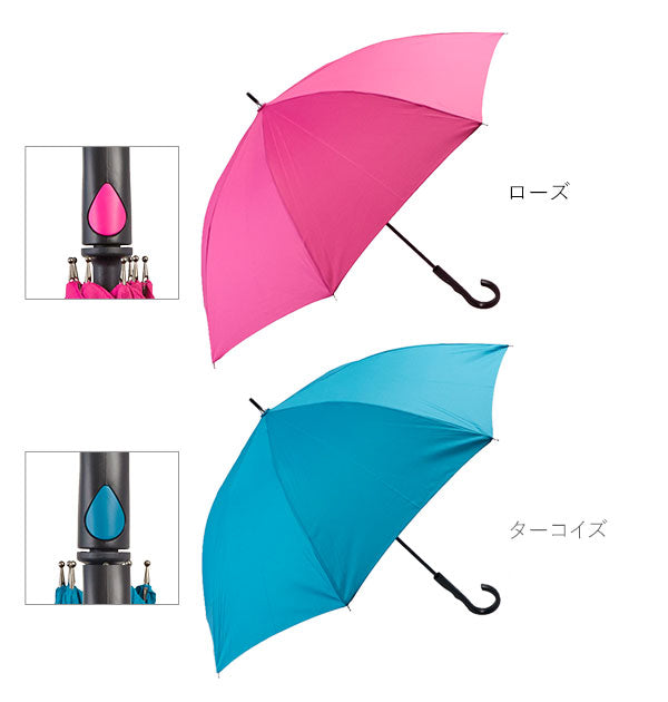 ワンタッチで開き、シンプルな無地の耐風長傘です。グラスファイバー骨を使用し、耐風設計(Z骨構造)なので、強い風が吹いて傘が反り返っても、折れにくくなっています。反り返った場合は、下ろくろを引いて元に戻せます。