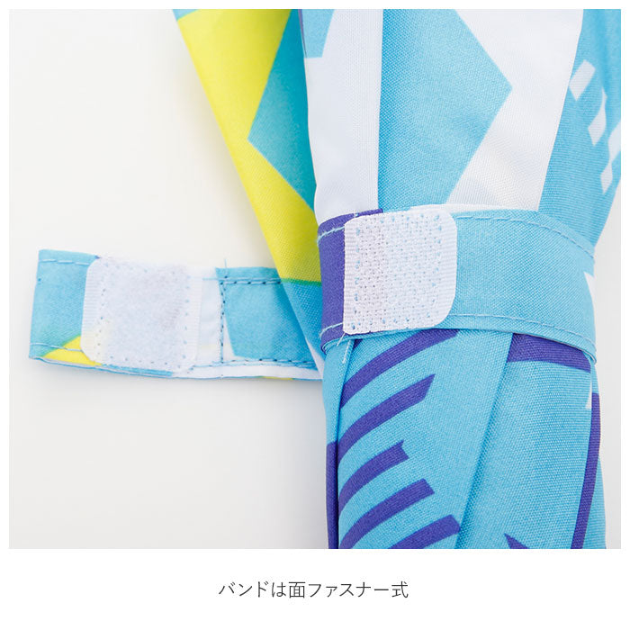 ・傘生地をまとめるバンドはマジックテープ式。お子様の指先が傷つかないよう、角が丸く加工されていて安心。お名前ネーム付きなので、お友だちの傘との取り違いも防げる。