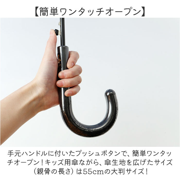 ・手元ハンドルに付いたプッシュボタンで、簡単ワンタッチオープン!キッズ用傘ながら、傘生地を広げたサイズ(親骨の長さ)は55cmの大判サイズ!