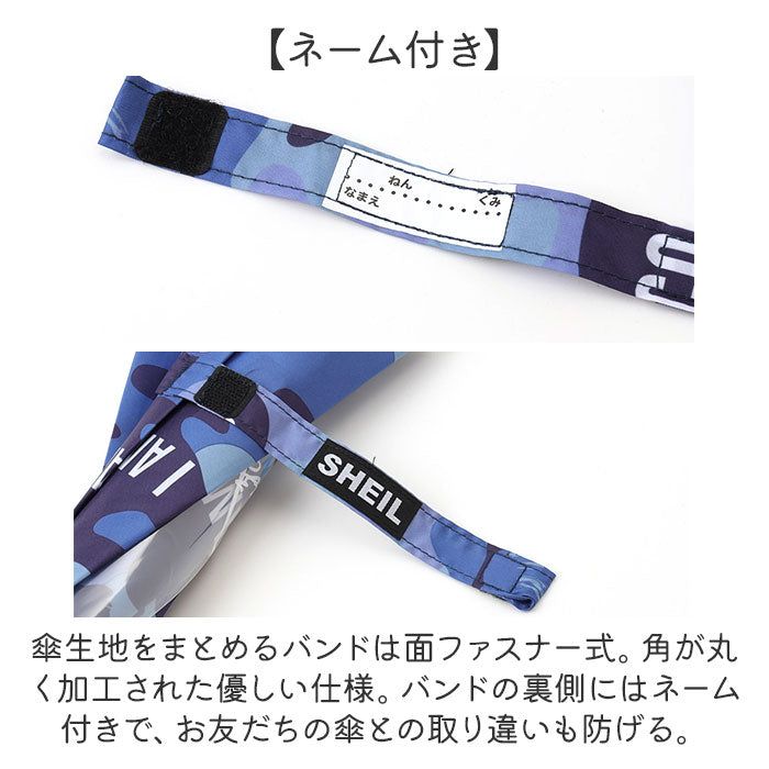 ・傘生地をまとめるバンドは面ファスナー式。お子様の指先が傷つかないよう、角が丸く加工された優しい仕様。バンドの裏側にはネーム付きで、お友だちの傘との取り違いも防げる。