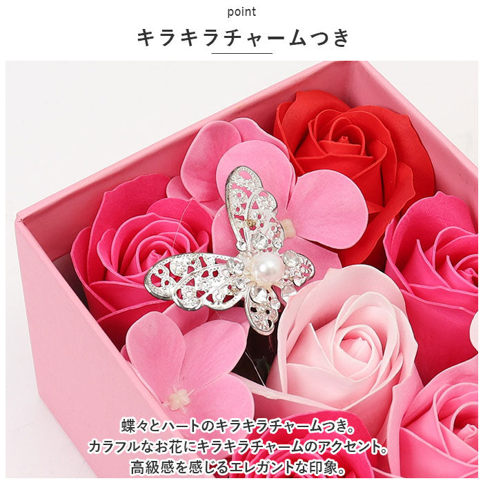 ・蝶々とハートのキラキラチャームつき。カラフルなお花にキラキラチャームのアクセント。高級感を感じるエレガントな印象。