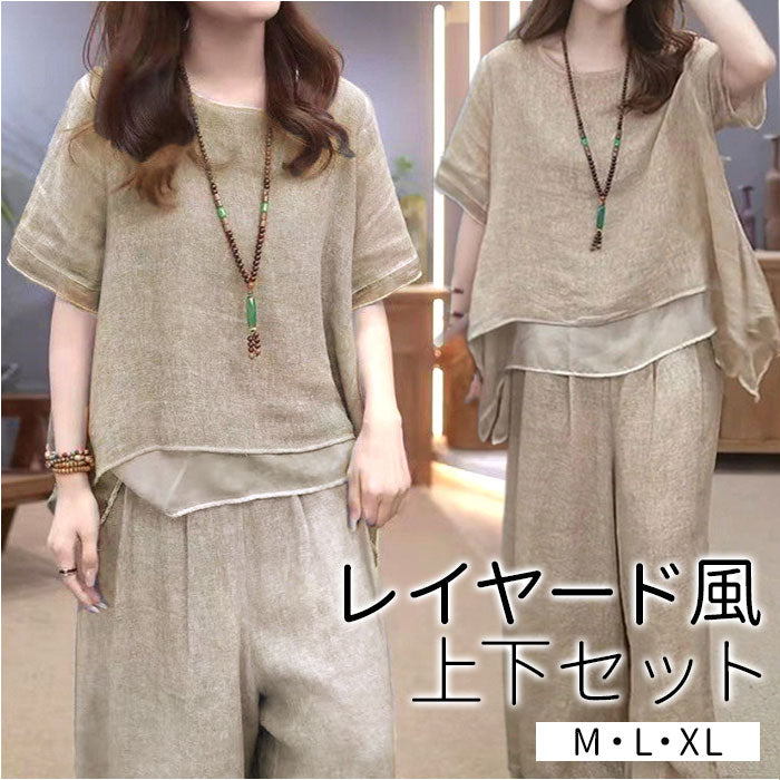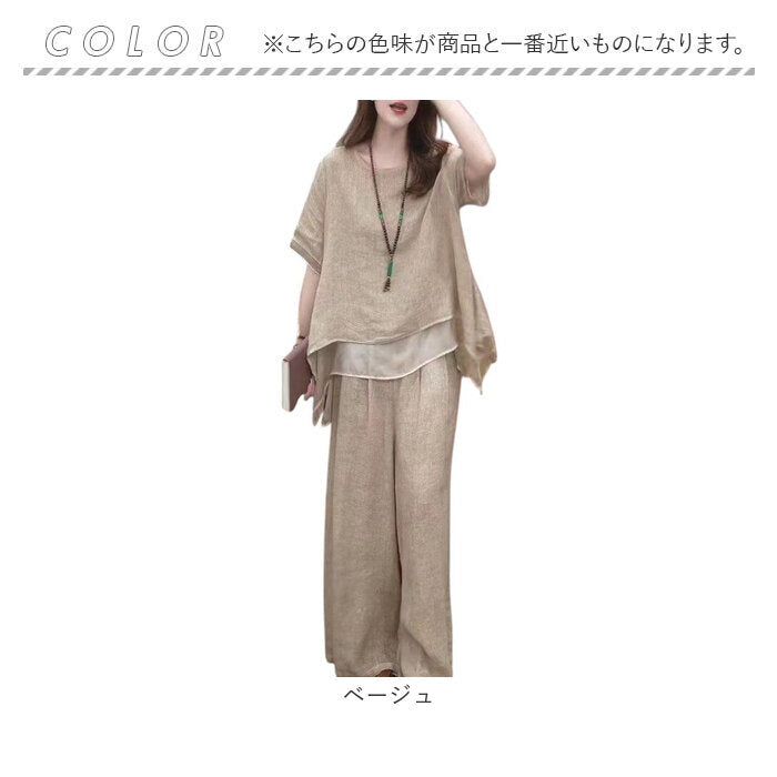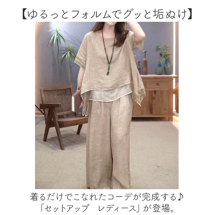 半袖 レディース 上下セット 通販 セットアップ ブラウス トップス ボトムス ワイドパンツ おしゃれ かわいい ナチュラル シンプル リラックス ゆったり 春 夏 体型カバー ルームウェア