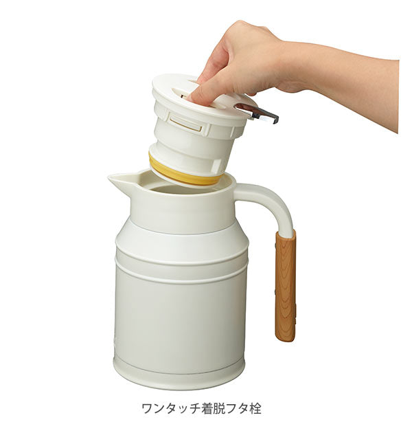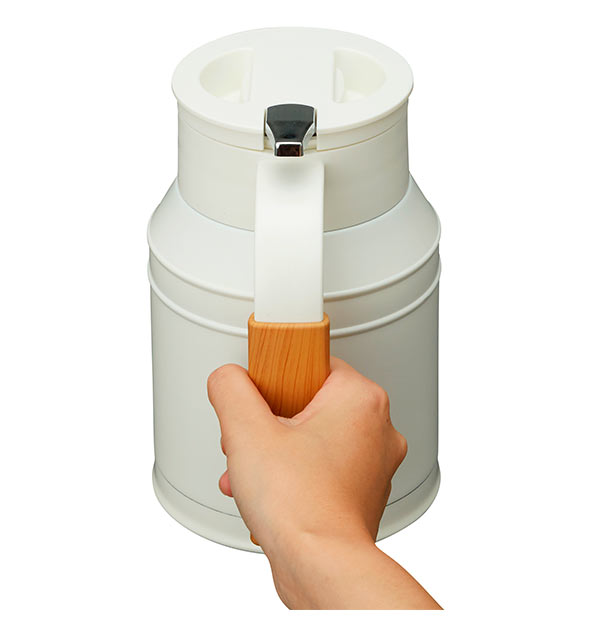 ステンレス真空二重構造のミルクのタンクをイメージしたおしゃれなポットです。外側が金属の部分もあり、取っ手も木目調で小さなミルクタンクのようですが、上部は押すことで開く注ぎ口や、本体は真空で保温 保冷もできるポットになっています。底部はターンテーブル付きで、置いたまま取っ手を持ちやすい位置に回すことができます。