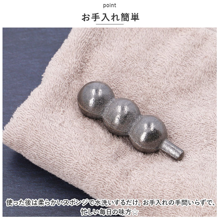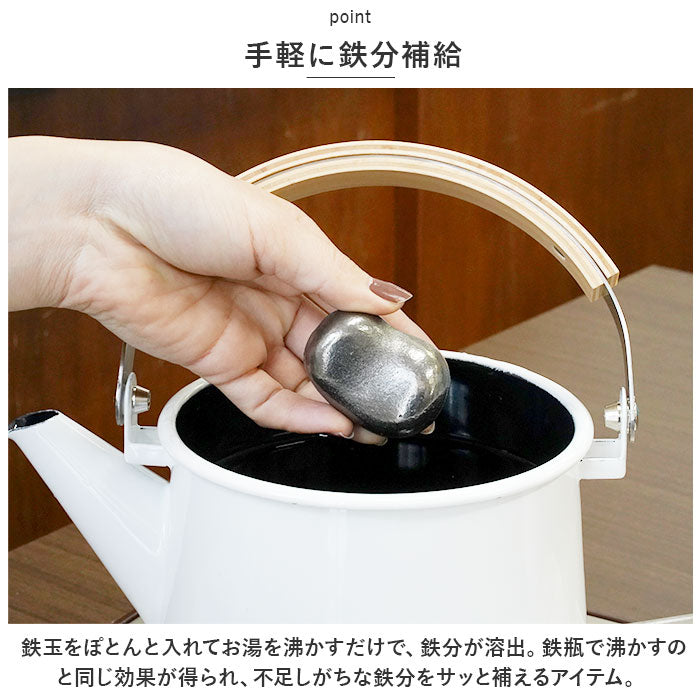 ・鉄玉をぽとんと入れてお湯を沸かすだけで、鉄分が溶出。鉄瓶で沸かすのと同じ効果が得られ、不足しがちな鉄分をサッと補えるアイテム。
