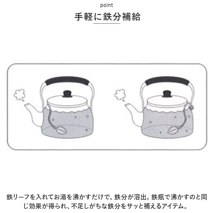 ・鉄リーフを入れてお湯を沸かすだけで、鉄分が溶出。鉄瓶で沸かすのと同じ効果が得られ、不足しがちな鉄分をサッと補えるアイテム。