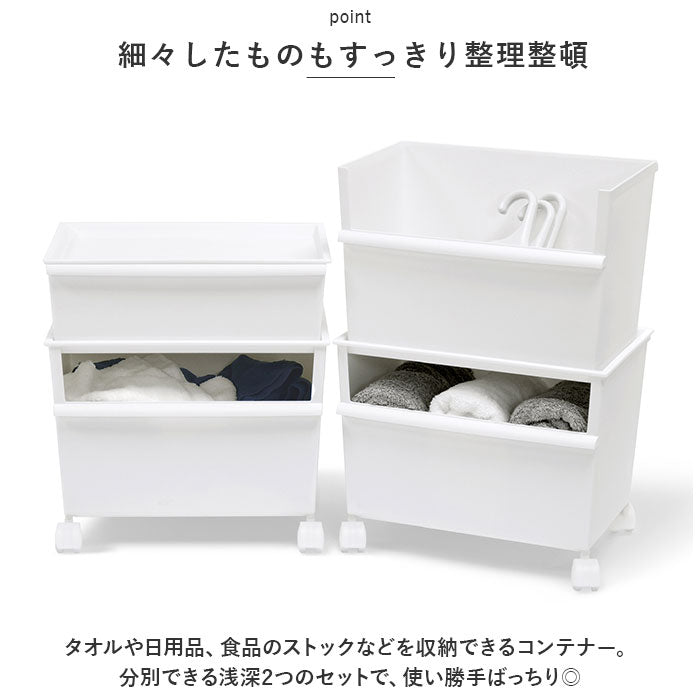 ・タオルや日用品、食品のストックなどを収納できるコンテナー。分別できる浅深2つのセットで、使い勝手ばっちり◎