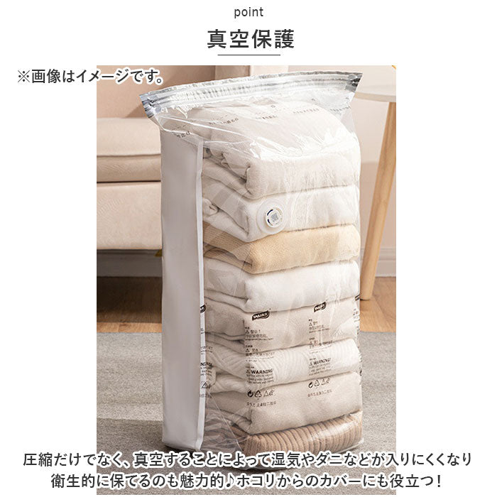 ・圧縮だけでなく、真空することによって湿気やダニなどが入りにくくなり衛生的に保てるのも魅力的♪ホコリからのカバーにも役立つ!