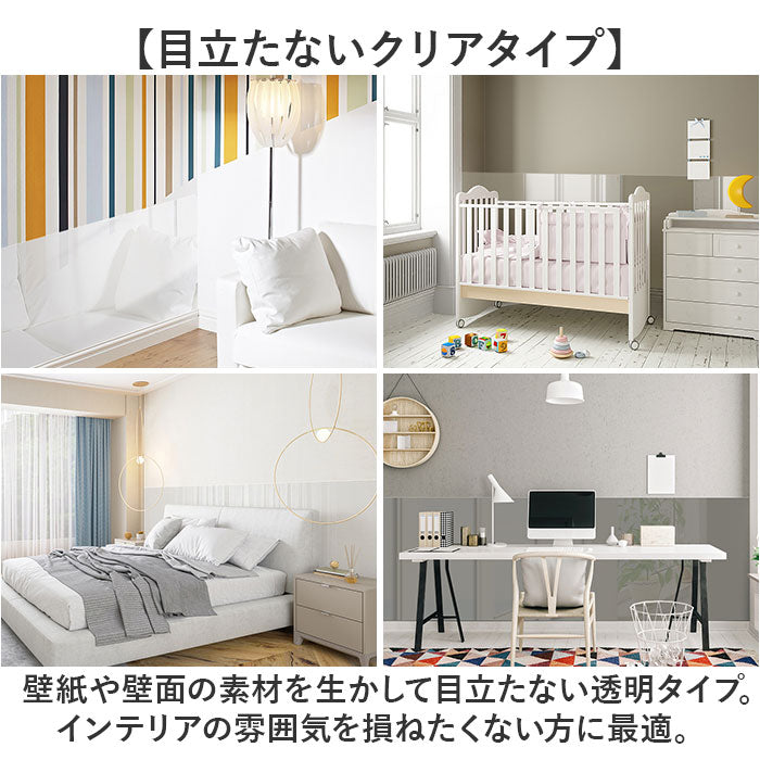 ・壁紙や壁面の素材を生かして目立たない透明タイプ。インテリアの雰囲気を損ねたくない方に最適。