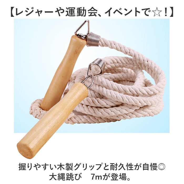 ・握りやすい木製グリップと耐久性が自慢◎大縄跳び 7mが登場。