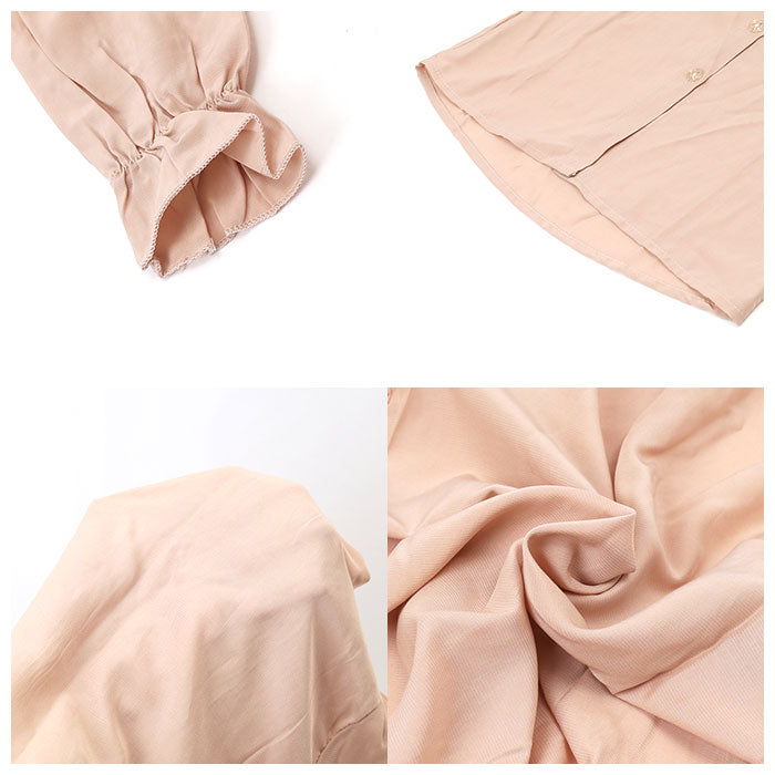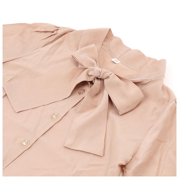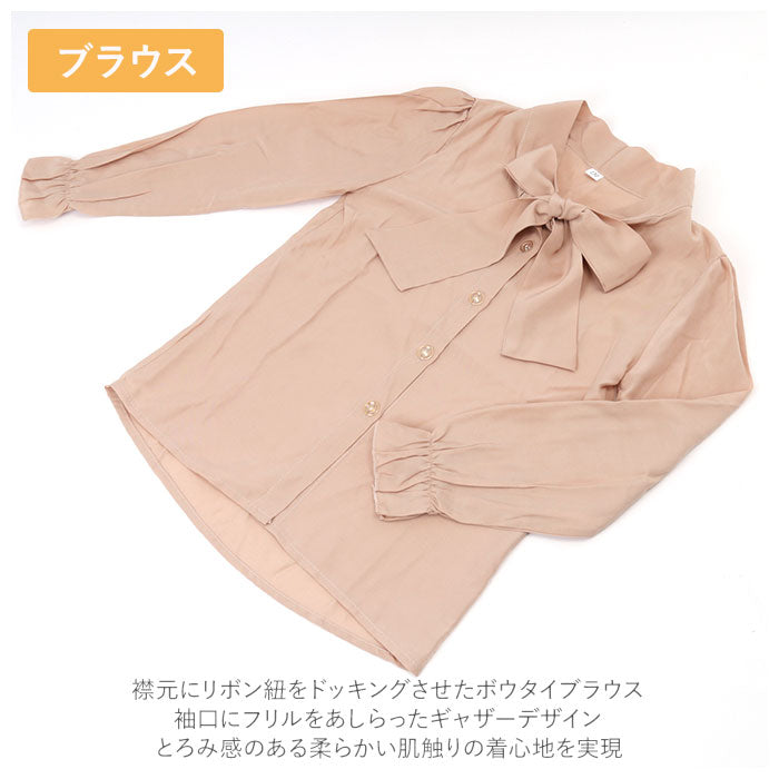 ・ブラウス・・・襟元にリボン紐をドッキングさせたボウタイブラウス。袖口にフリルをあしらったギャザーデザイン。とろみ感のある柔らかい肌触りの着心地を実現。