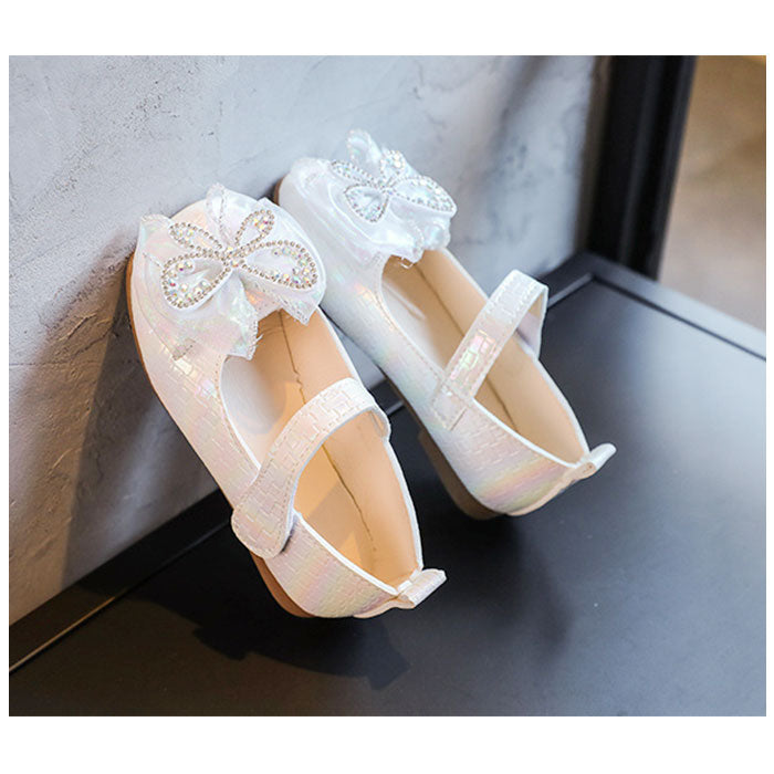 ・光沢のある合皮素材を使用。つま先部分に配置された立体的な蝶が印象的♪キラッと光るリボンやストーンもプラス。