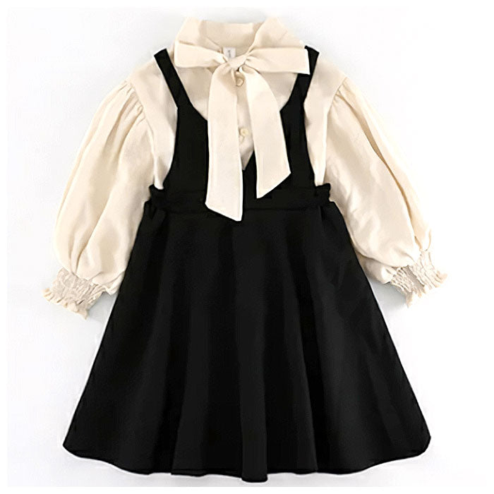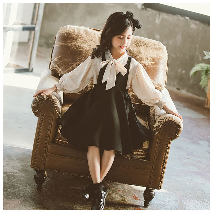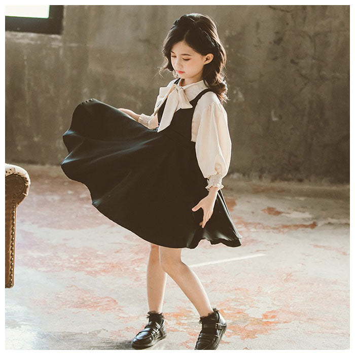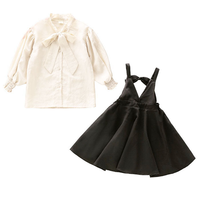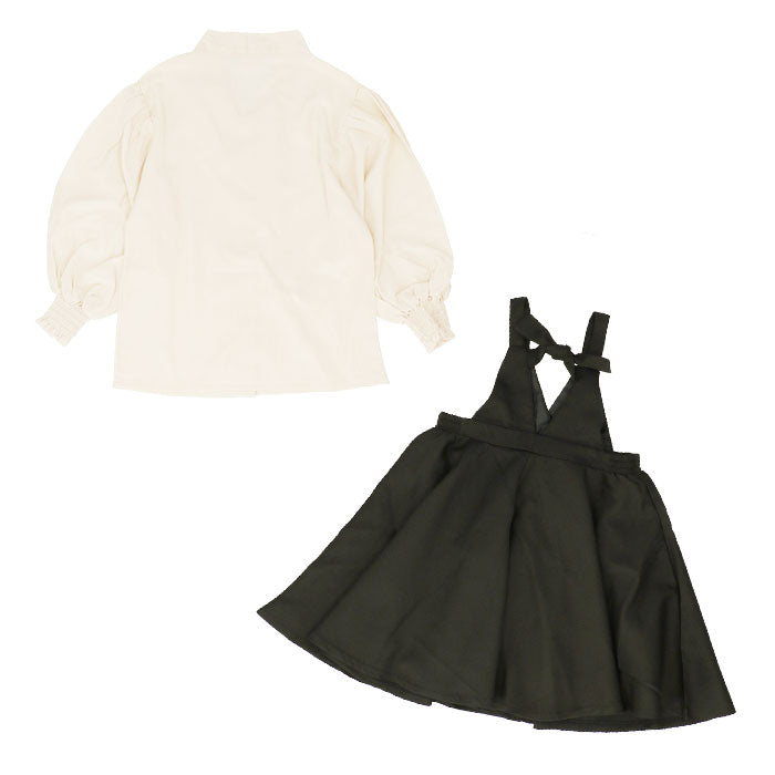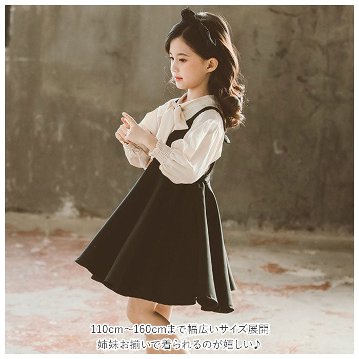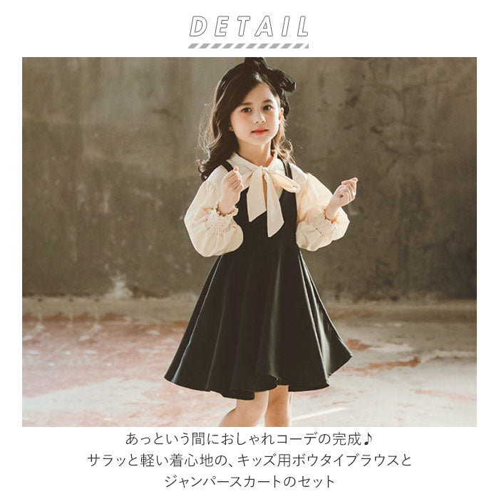 ・あっという間におしゃれコーデの完成♪サラッと軽い着心地の、キッズ用ボウタイブラウスとジャンパースカートのセット。