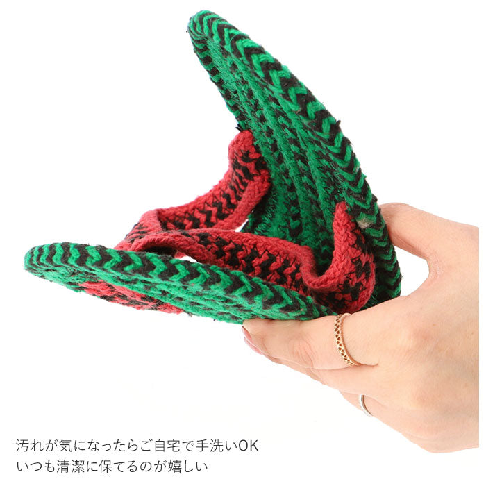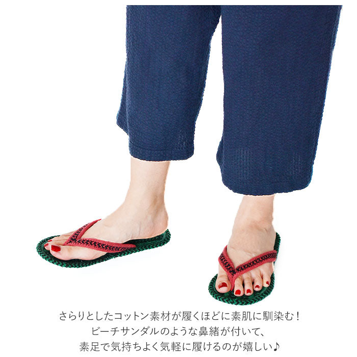 ・さらりとしたコットン素材が履くほどに素肌に馴染む!ビーチサンダルのような鼻緒が付いて、素足で気持ちよく気軽に履けるのが嬉しい。