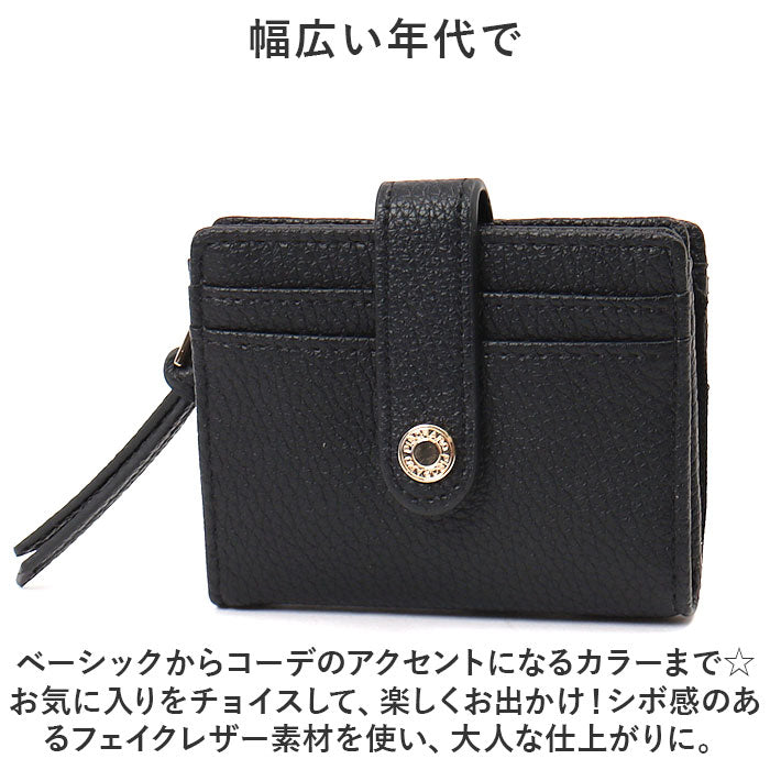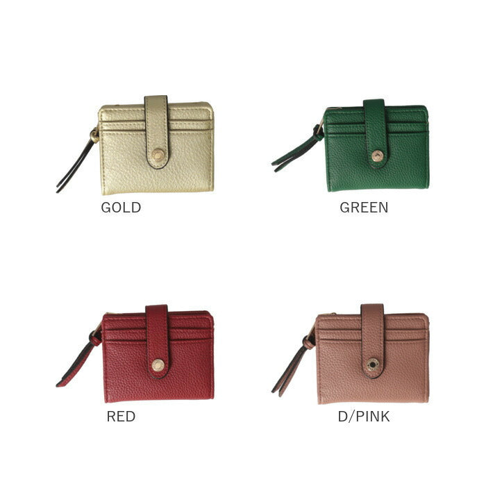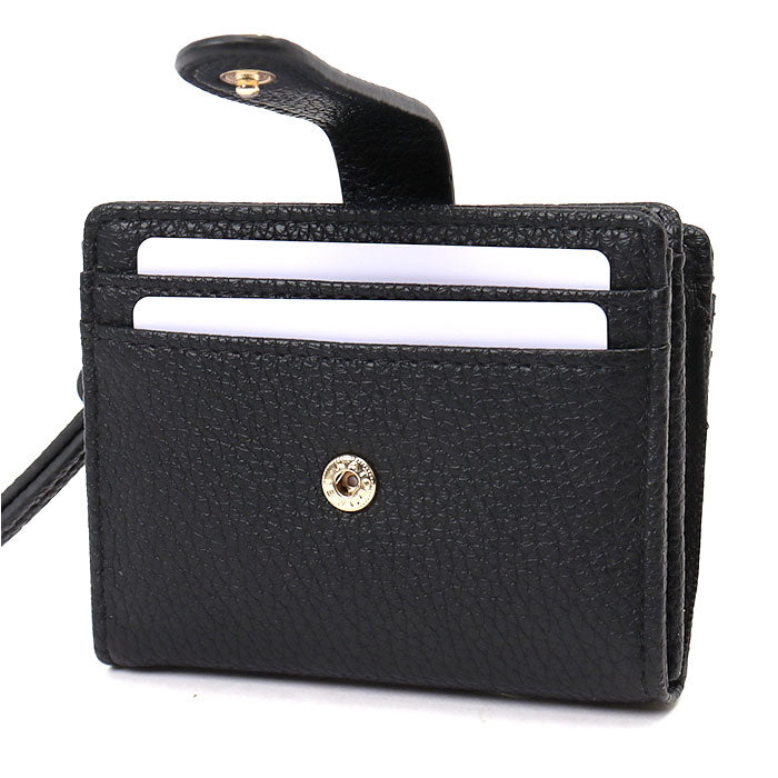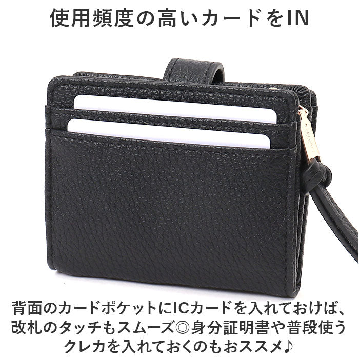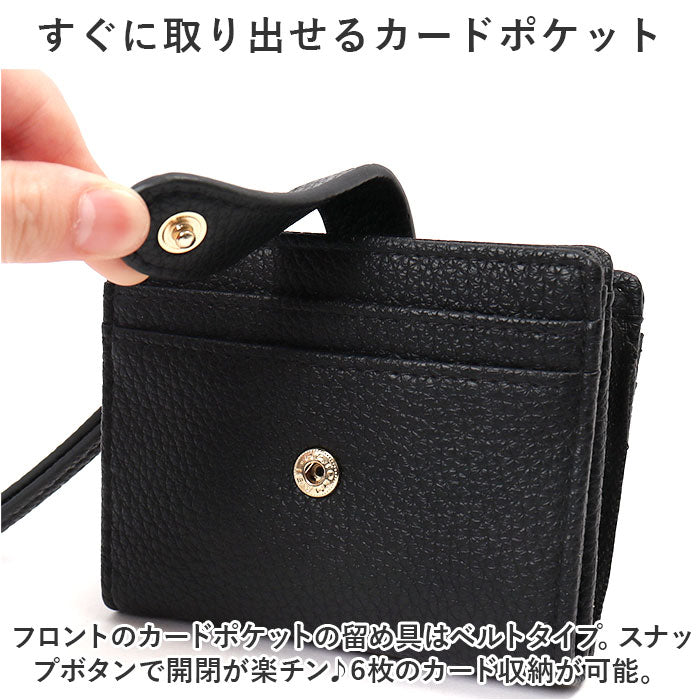 ・フロントのカードポケットの留め具はベルトタイプ。スナップボタンで開閉が楽チン♪6枚のカード収納が可能。