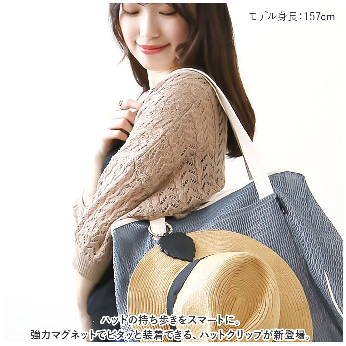 ・強力なマグネットが内蔵されており、ハットを挟んで留めるだけ。リング部分をバッグのハンドルなどに取り付ければ、手持ちすることなくラクラク持ち運べちゃう♪
