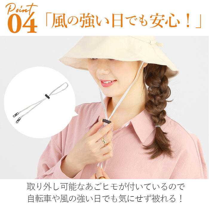 ・取り外し可能なあご紐が付属しているので風の強い日でも気にせず被れる。