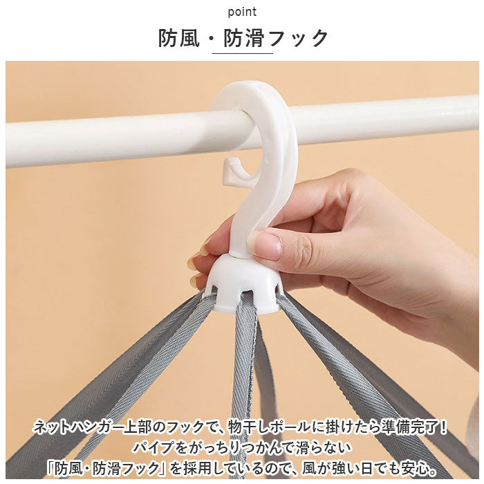 ・ネットハンガー上部のフックで、物干しポールに掛けたら準備完了!パイプをがっちりつかんで滑らない「防風・防滑フック」を採用しているので、風が強い日でも安心。