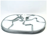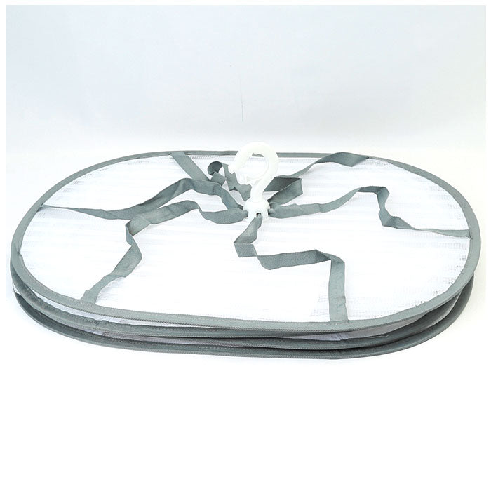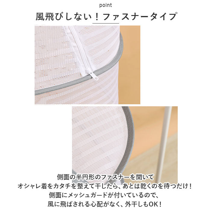 ・側面の半円形のファスナーを開いてオシャレ着をカタチを整えて干したら、あとは乾くのを待つだけ!側面にメッシュガードが付いているので、風に飛ばされる心配がなく、外干しもOK!