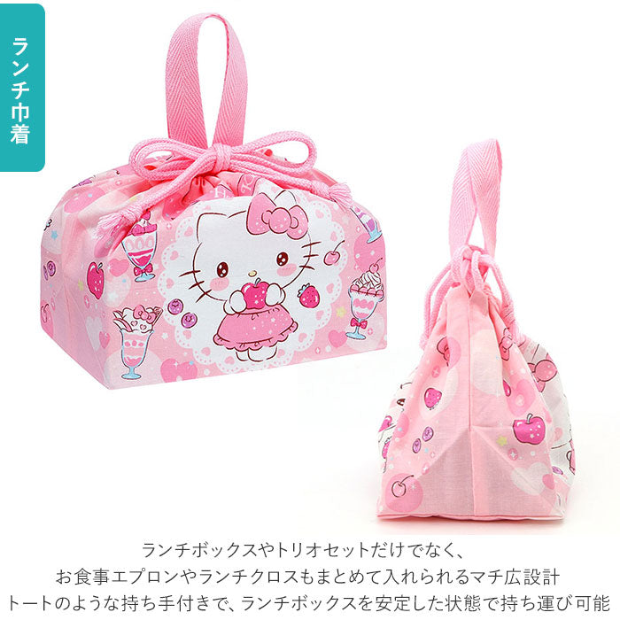 【ランチ巾着】…ランチボックスやトリオセットだけでなく、お食事エプロンやランチクロスもまとめて入れられるマチ広設計。