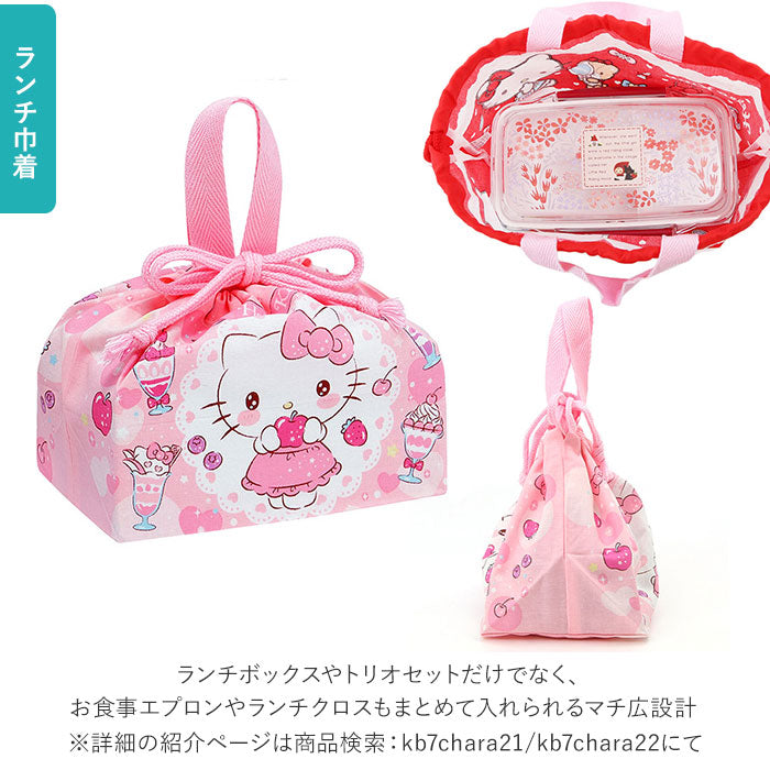 【ランチ巾着】…ランチボックスやトリオセットだけでなく、お食事エプロンやランチクロスもまとめて入れられるマチ広設計。