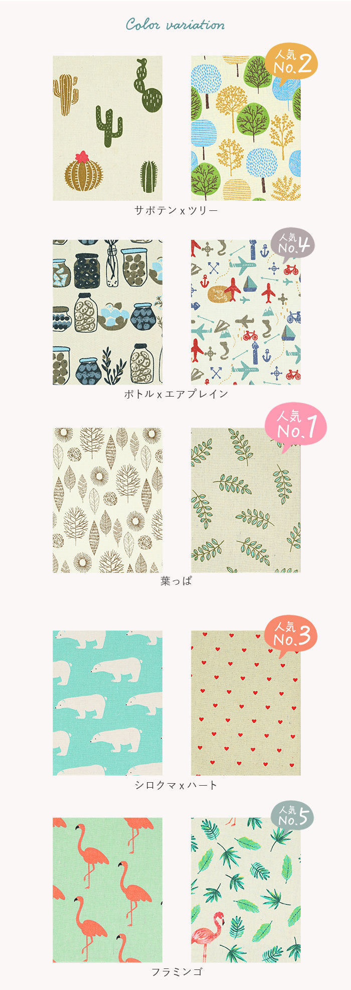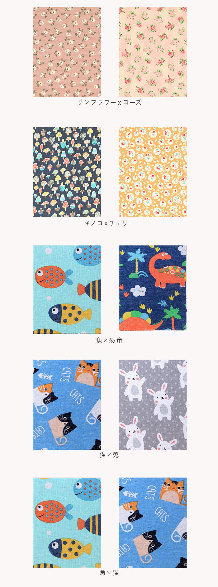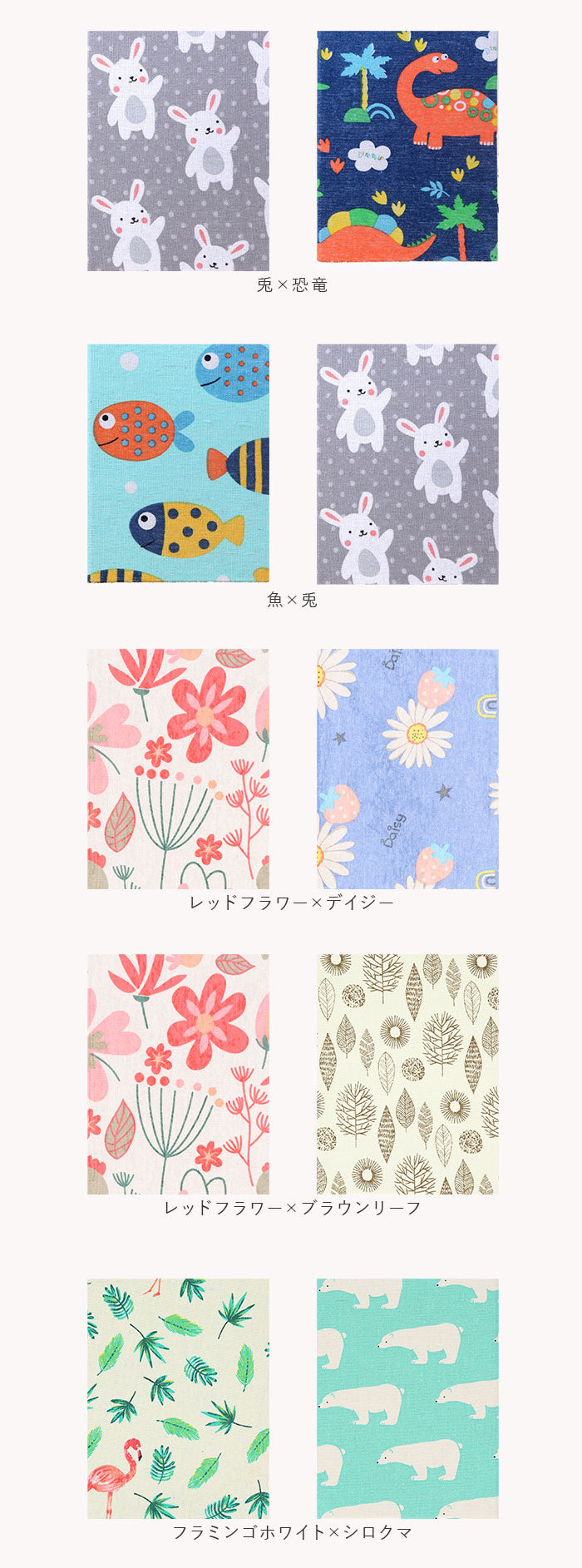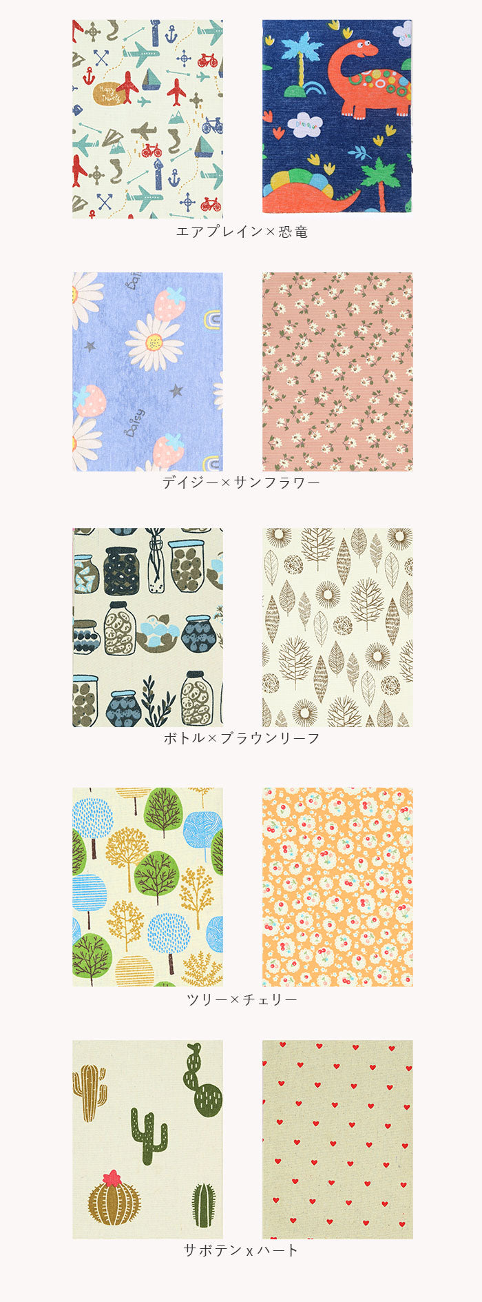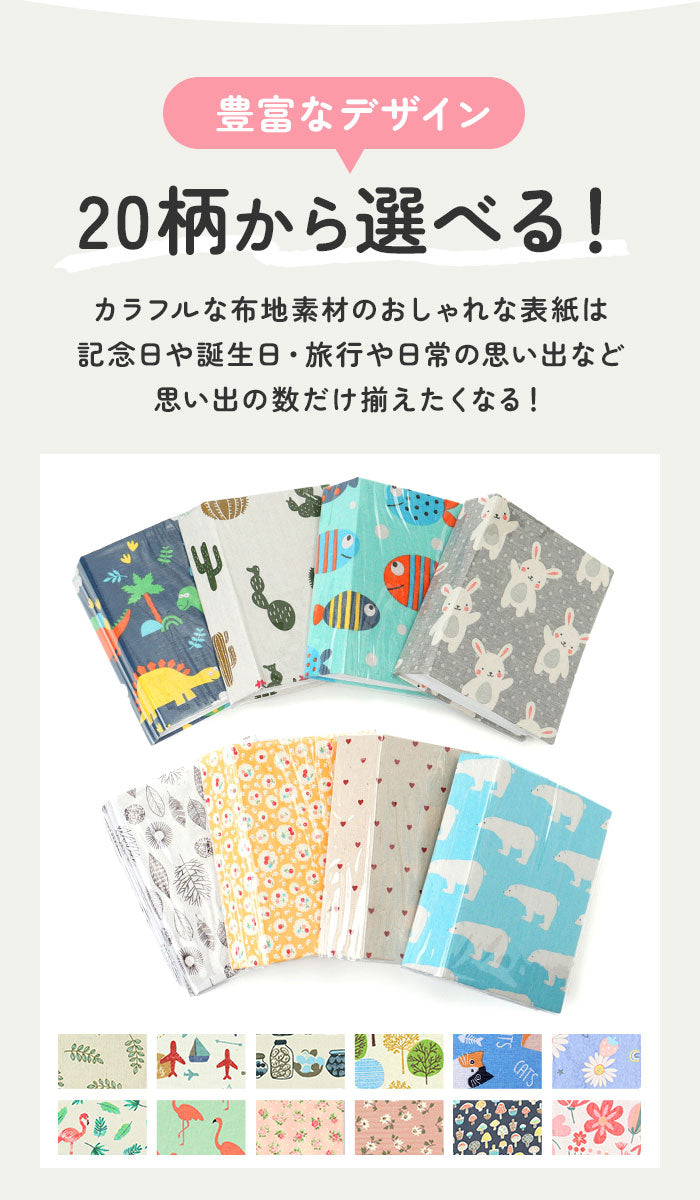 ・表紙はナチュラルなキャンバスファブリック仕上げ。ボタニカルやアニマル柄のプリントが、インテリアに素敵にマッチ!本棚やキャビネットに並べておくだけで、お部屋がほっこり優しい雰囲気に。