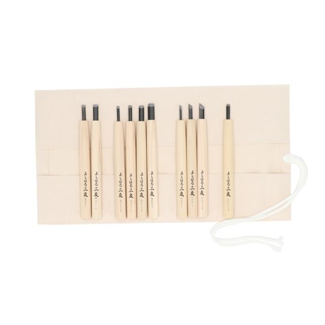 彫刻刀セット 10本 通販 よしはる 三友 彫刻刀 10本組 セット 印刀 平刀 三角刀 丸刀 版画 年賀状 彫刻 アート 芸術 趣味 布ケース入り 高タングステンクロム鋼 ニ層鋼 セミプロ用