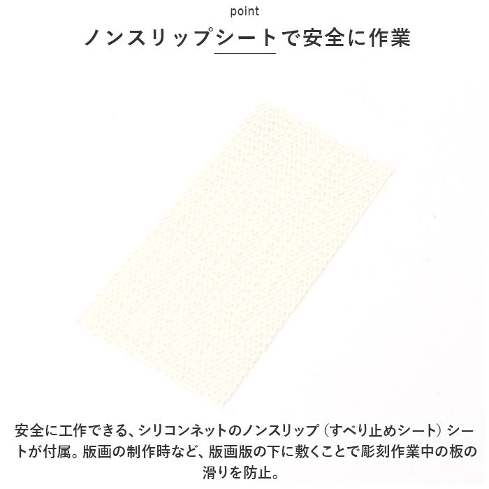 ・安全に工作できる、シリコンネットのノンスリップ(すべり止めシート)シートが付属。版画の制作時など、版画版の下に敷くことで彫刻作業中の板の滑りを防止。