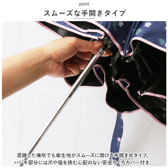 ・混雑した場所でも傘生地がスムーズに開ける手開き式タイプ。ハジキ部分には爪や指を挟む心配のない安全ろくろカバー付きだから安心。