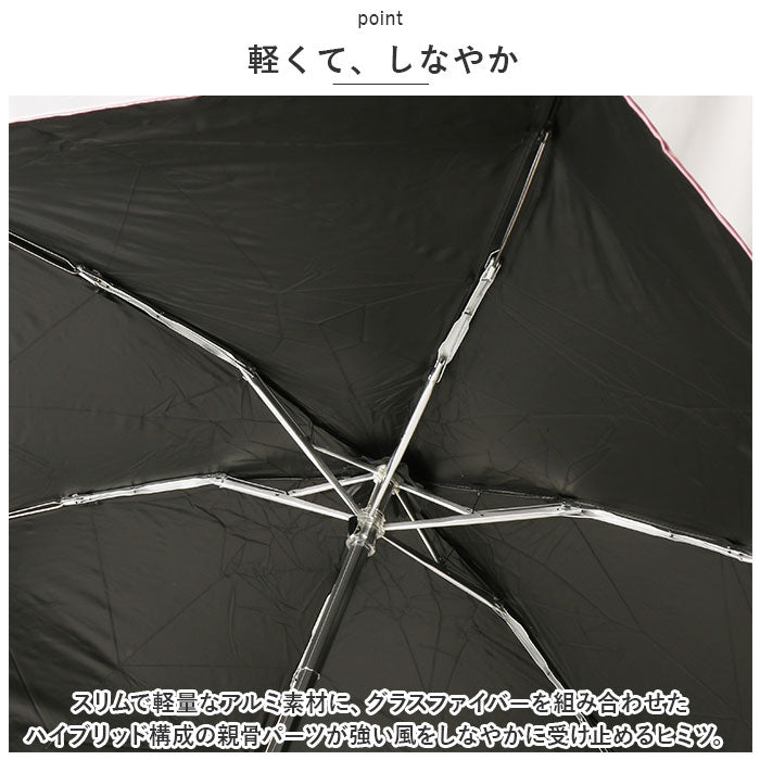 ・スリムで軽量なアルミ素材に、グラスファイバーを組み合わせたハイブリッド構成の親骨パーツが強い風をしなやかに受け止めるヒミツ。