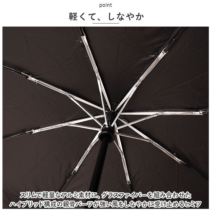 ・スリムで軽量なアルミ素材に、グラスファイバーを組み合わせたハイブリッド構成の親骨パーツが強い風をしなやかに受け止めるヒミツ。