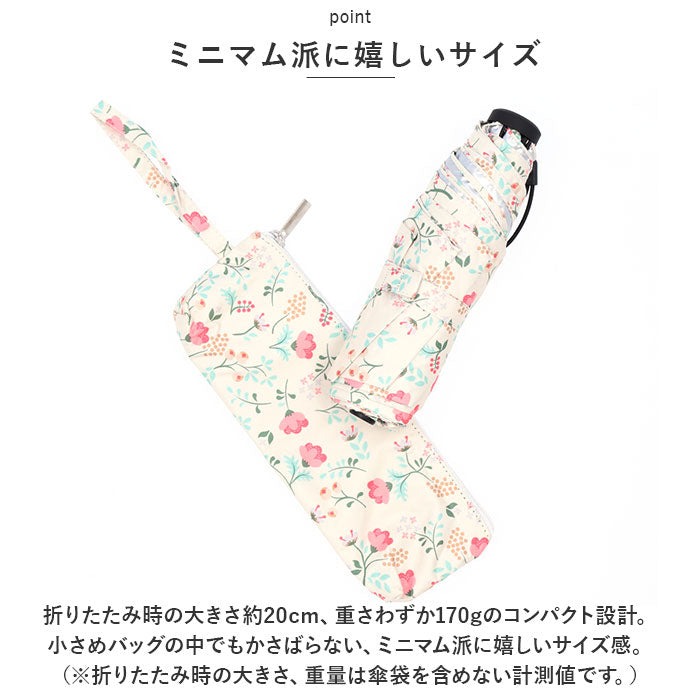 ・折りたたみ時の大きさ約20cm、重さわずか170gのコンパクト設計。小さめバッグの中でもかさばらない、ミニマム派に嬉しいサイズ感。(※折りたたみ時の大きさ、重量は傘袋を含めない計測値です。)