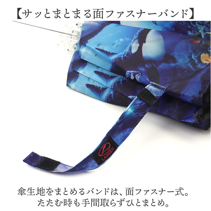 ・傘生地をまとめるバンドは、面ファスナー式。たたむ時も手間取らずひとまとめ。