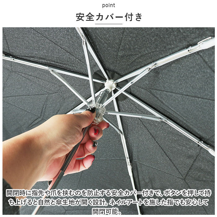 ・開閉時に指先や爪を挟むのを防止する安全カバー付きで、ボタンを押して持ち上げると自然と傘生地が開く設計。ネイルアートを施した指でも安心して開閉可能。