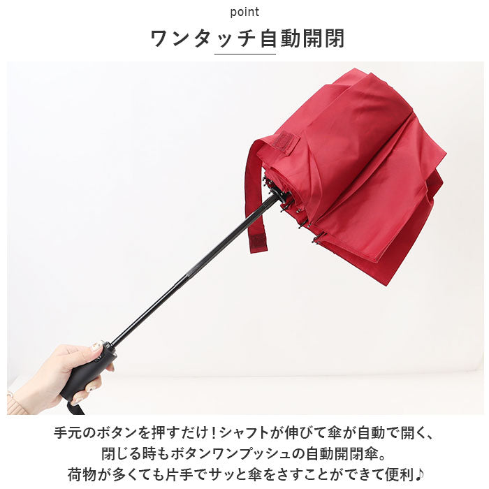 ・手元のボタンを押すだけ!シャフトが伸びて傘が自動で開く、閉じる時もボタンワンプッシュの自動開閉傘。荷物が多くても片手でサッと傘をさすことができて便利♪
