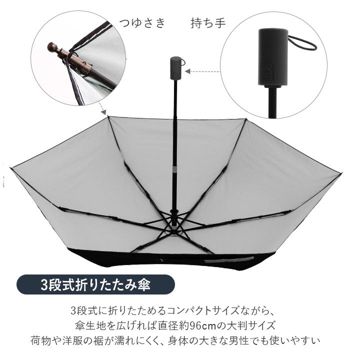 ・3段式に折りたためるコンパクトサイズながら、傘生地を広げれば直径約96cmの大判サイズ。荷物や洋服の裾が濡れにくく、身体の大きな男性でも使いやすい。