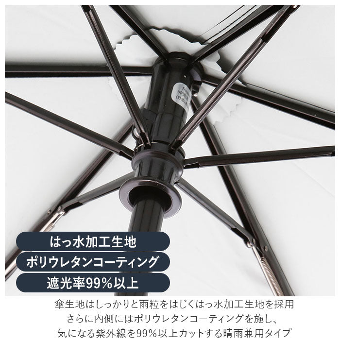 ・傘生地はしっかりと雨粒をはじくはっ水加工生地を採用。さらに内側にはポリウレタンコーティングを施し、気になる紫外線を99%以上カットする晴雨兼用タイプ。強い日差しが気になるこれからの季節にもぴったり。